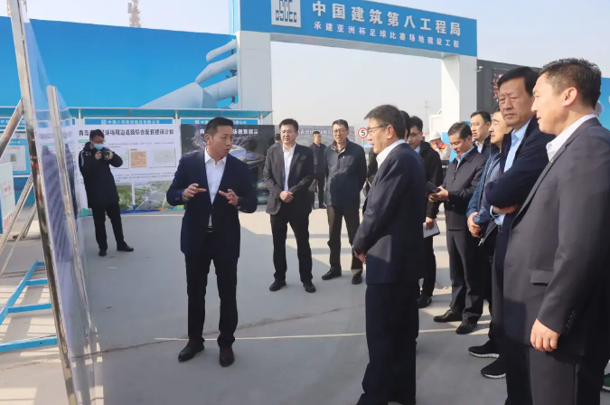 3月25日,亚洲杯中国组委会秘书长史强及山东省体育局相关领导到中建八局四亚洲杯青岛青春足球场项目调研青岛赛区场馆建设、综合协调、规划建设等情况。