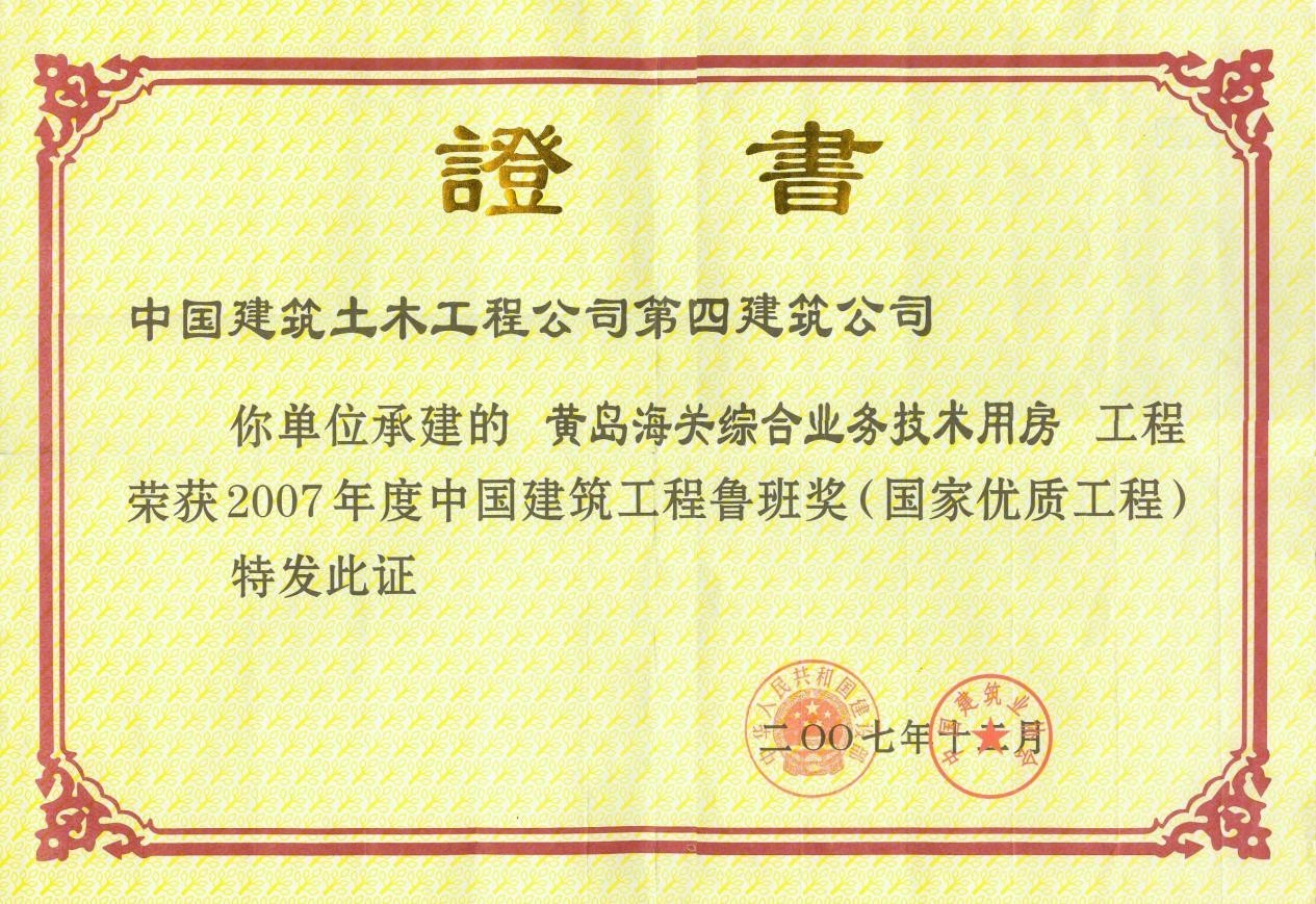 黄岛海关业务楼荣获2007年度鲁班奖,该工程位于青岛经济技术开发区长江中路,是青岛市最著名的标志性建筑之一,由黄岛海关投资兴建,由澳大利亚ANS建筑设计事务所设计,山东省建筑设计研究院进行设计深化,青岛建工学院工程建设监理公司监理,中建八局第四建设有限公司施工。该工程为框剪结构,地下2层,地上19层,建筑高度约93.10米,总建筑面积35253㎡。工程于2005年3月18日开工,2006年9月20日竣工,是包括综合业务(监管、征管、缉私、统计)和技术服务职能的大型智能化公共建筑。